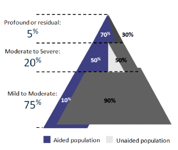 Figure 2. The unmet need of individuals with hearing loss. Of people with hearing loss, 75% have a mild-moderate loss but only 10% have done something about it. As hearing loss increases, the number of individuals that manage it increases [3].