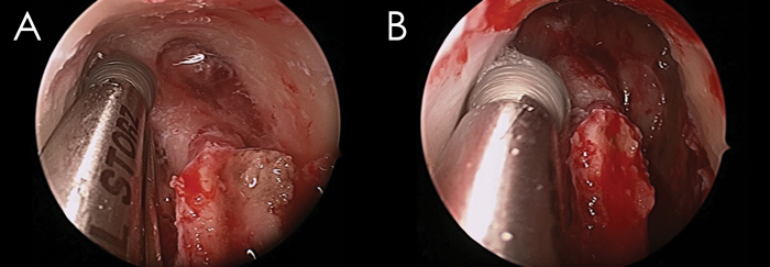 Figure 2. The ‘outside-in’ approach to Draf 3 uses a 0 degree endoscope to find the periosteum and first olfactory fascicle early in the case (A) and then drilling proceeds without angulation to create a maximal opening (B).