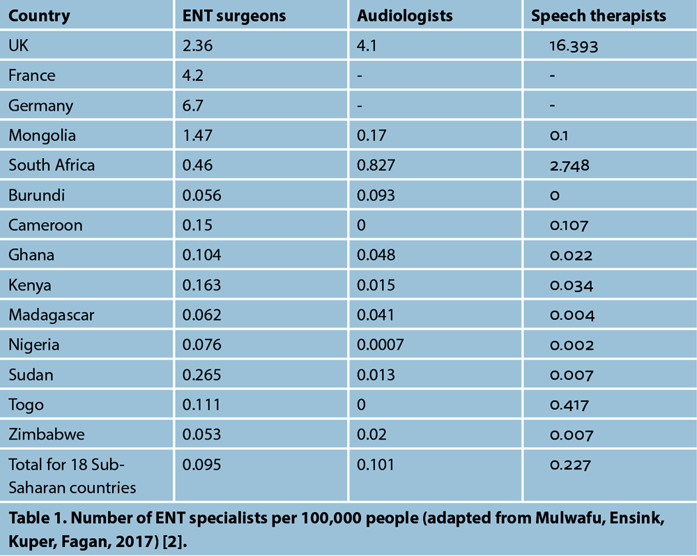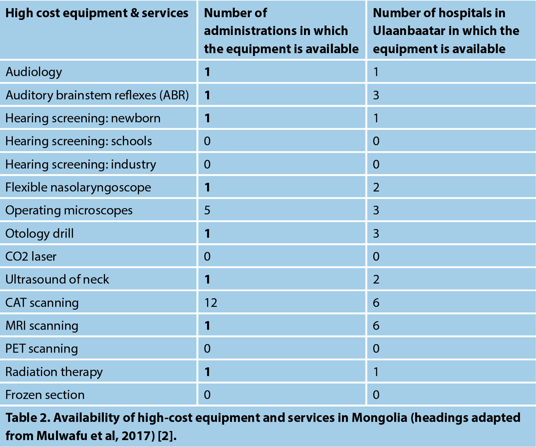 In the developing world, specialist ENT practitioners and training programmes are scarce. Table 1 shows the insufficiency of ENT services in Mongolia and Africa. Whilst Mongolia seems to do significantly better than African countries, these are almost entirely centralised in the capital, Ulaanbaatar. Mongolia is composed of 21 provinces but Ulaanbaatar is counted as a separate administration. One third of the Mongolian provinces have no access to an ENT surgeon at all. Additionally, Mongolia has no ENT allied health professional training programmes.
