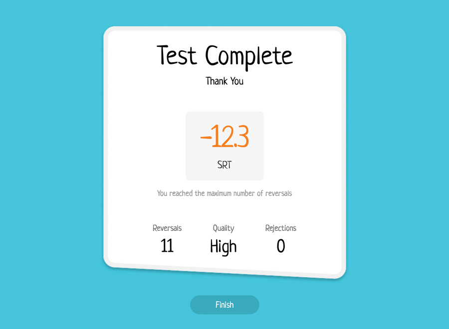 PAAST is designed to be used by professionals for screening, diagnostic and / or post-diagnostic purposes. The reliability of the test in estimating the SRT in noise was evaluated with 40 normal-hearing Arabic children and showed that the test can estimate, with a probability of >0.95, an SRT that lies within ±4dB of a child’s true threshold. The mean SRT was -5dB SNR and -8dB SNR for children aged three-to-six years and children aged six years and above, respectively.