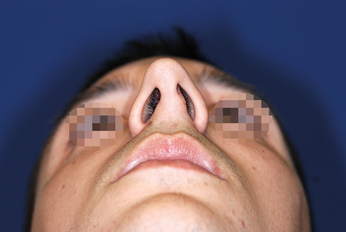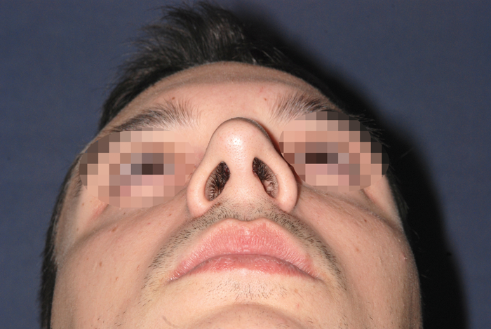 Figure 2. Preoperative (top) and postoperative (bottom) base views of a paradigmatic post-traumatic displacement of the caudal septum. The endonasal retropositioning of the septo-spinal complex allowed the recreation of a more functional and aesthetical relationship between the infratip and the height of the nostrils, as well as improving the symmetry of the entire base view.