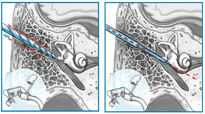 This surgical procedure consists of three major consecutive phases: the middle ear access, the inner ear access (cochlea) and the electrode insertion.