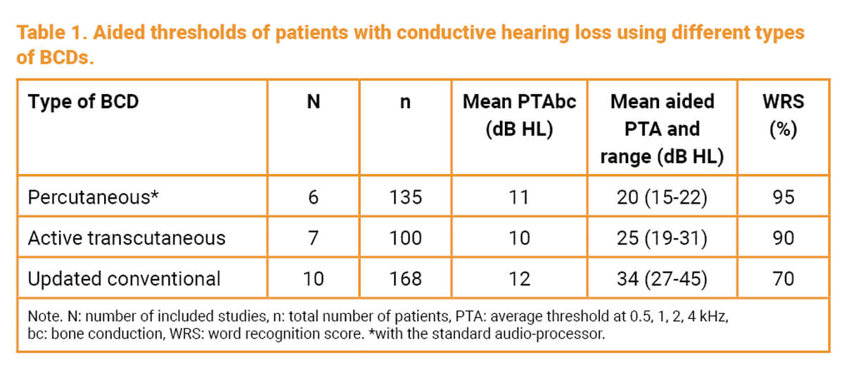 To compare the efficiency of the different types of BCD, a focused literature search was carried out, period 2010-2021 [3, Ch. 7.2.1]. Papers presenting aided thresholds of subjects with pure conductive hearing loss (cochlear thresholds < 20 dB HL) were selected. An overview of the data is presented in Table 1. Using the speech intelligibility index (SII) [3, Ch. 7.1] word scores were calculated; presented in the table. Clearly, the devices are not equivalents.