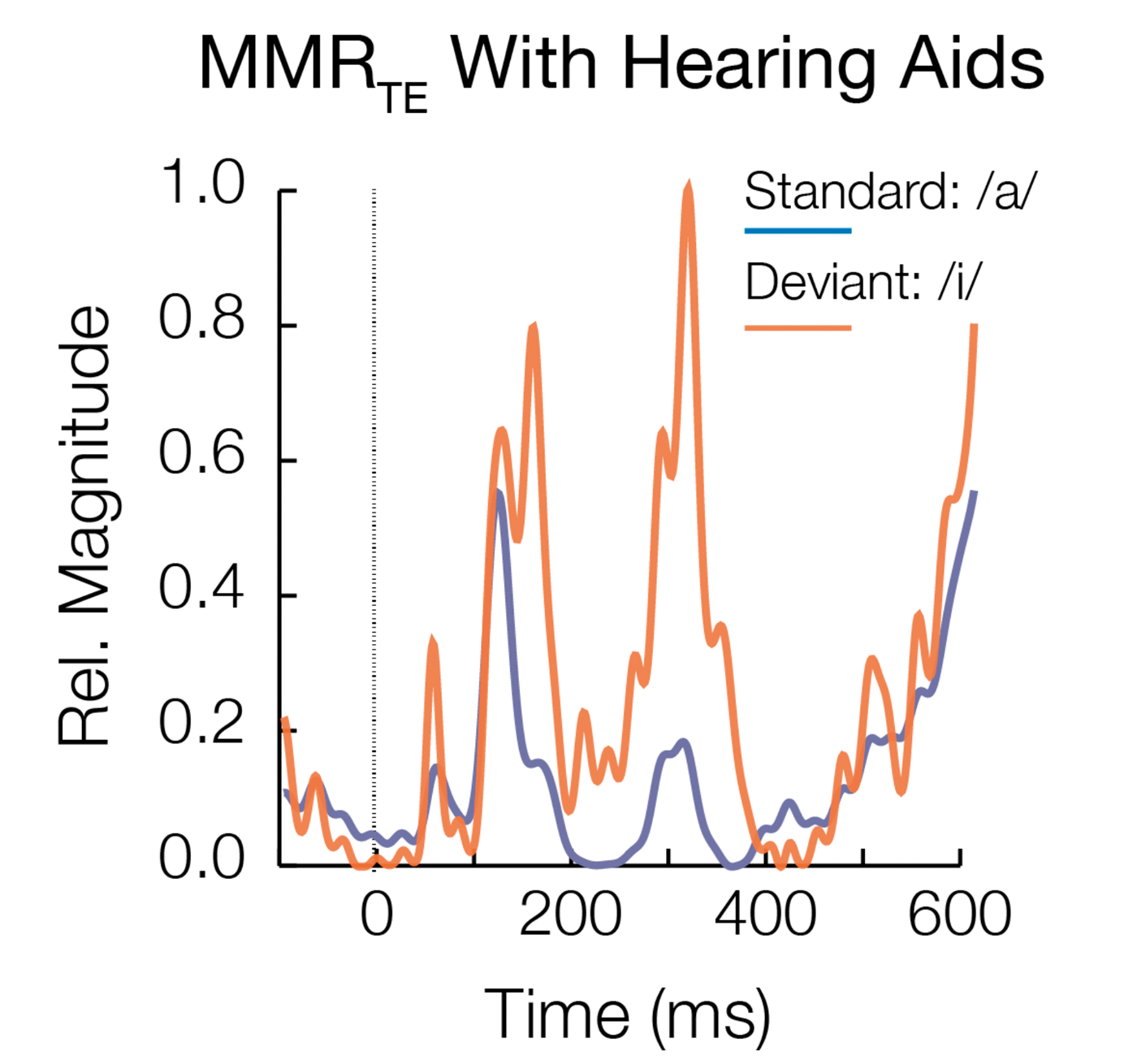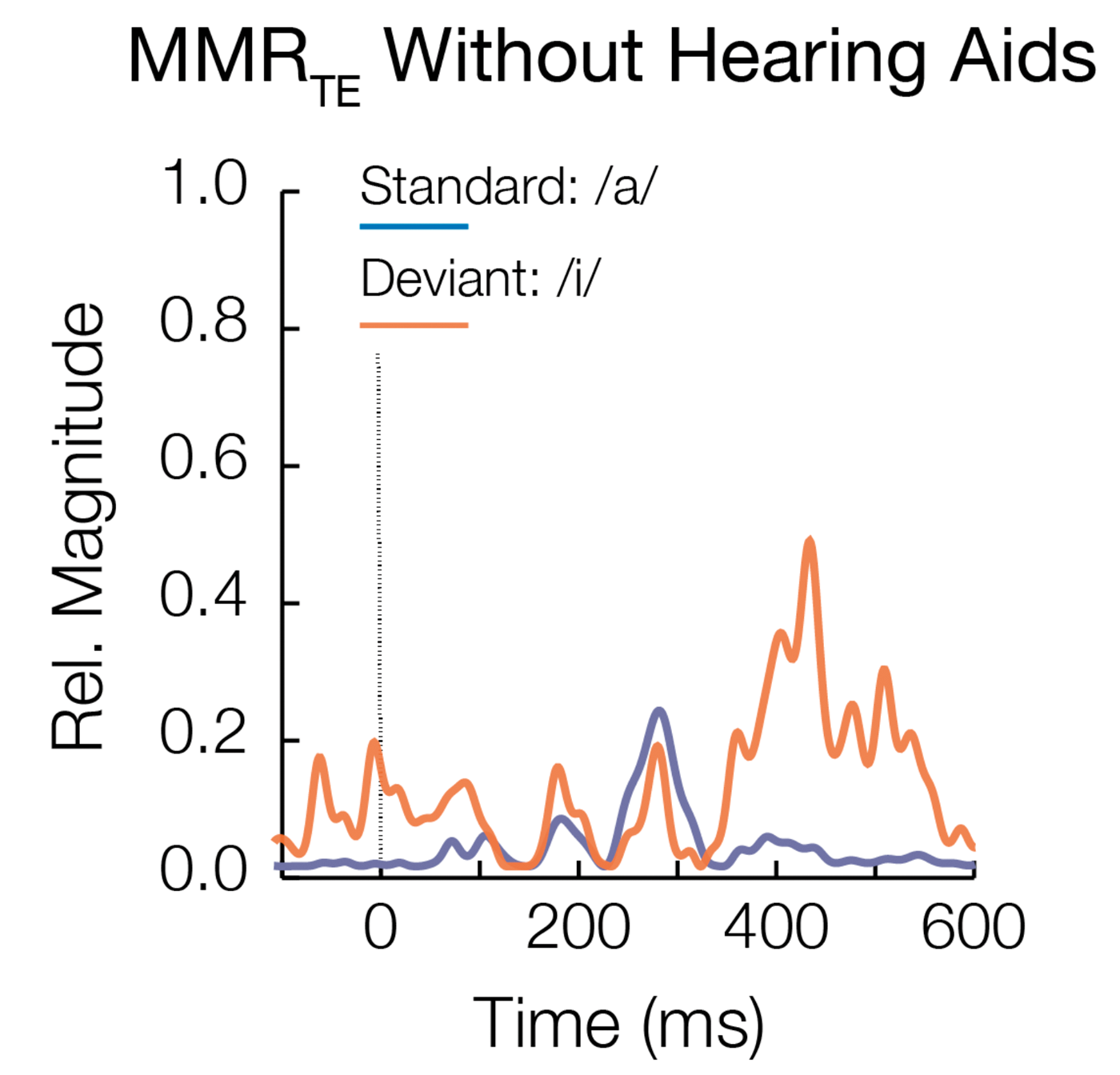 Discrimination of speech sounds is the foundation for development of spoken language. The knowledge gained from being able to objectively document that an infant can discriminate speech while wearing their hearing aids is twofold: 1) over time it could improve paediatric hearing aid fittings and 2) it could improve counselling provided to families. Currently, once hearing aids are fit, there is a wait and see approach to validation, and much of what is used clinically is subjective parent report measures [1]. The use of an objective measure of speech discrimination may increase parental understanding of their child’s hearing loss and the importance of hearing aid use. Specifically, if a parent can see differences in how their infant’s brain responds to speech sounds with versus without hearing aids (see Figure 1), it may lead to improved acceptance and hearing aid use.