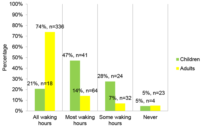With regard to the BCHI users with unilateral hearing loss, clinicians have reported (n=542), 16% (n=87) are children and 84% (n=455) adults fitted with a BCHI. Figure 3 illustrates the current amount of usage of their BCHI.