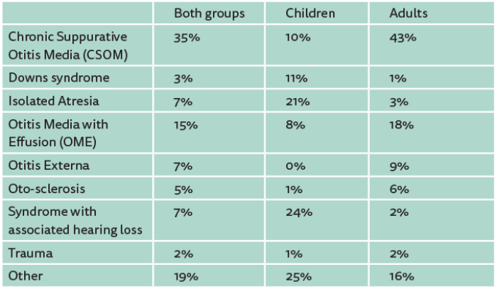 Table 1 shows the causes of hearing loss and the numbers (%) in both groups, children and adults. The most common cause of hearing loss for children is syndrome with associated hearing loss, and for adults it is Chronic Suppurative Otitis Media (CSOM).