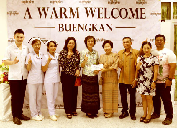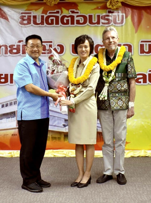 The new director and her husband, Robert Mills, are welcomed to Bueng Kan Hospital by her predecessor.