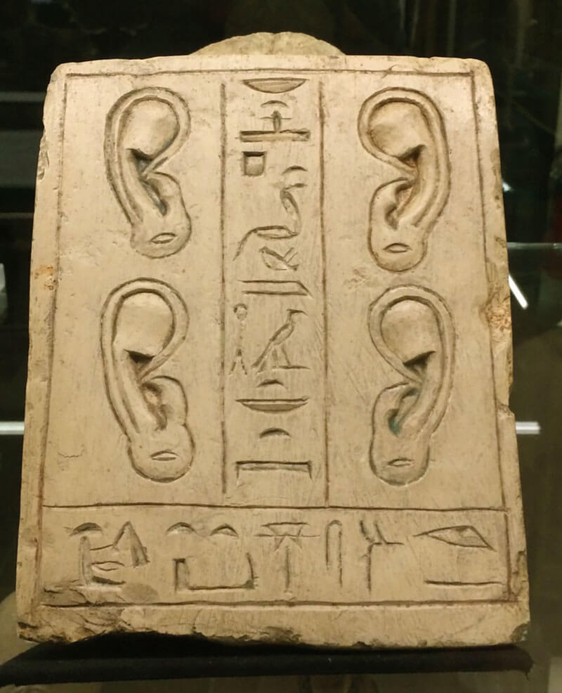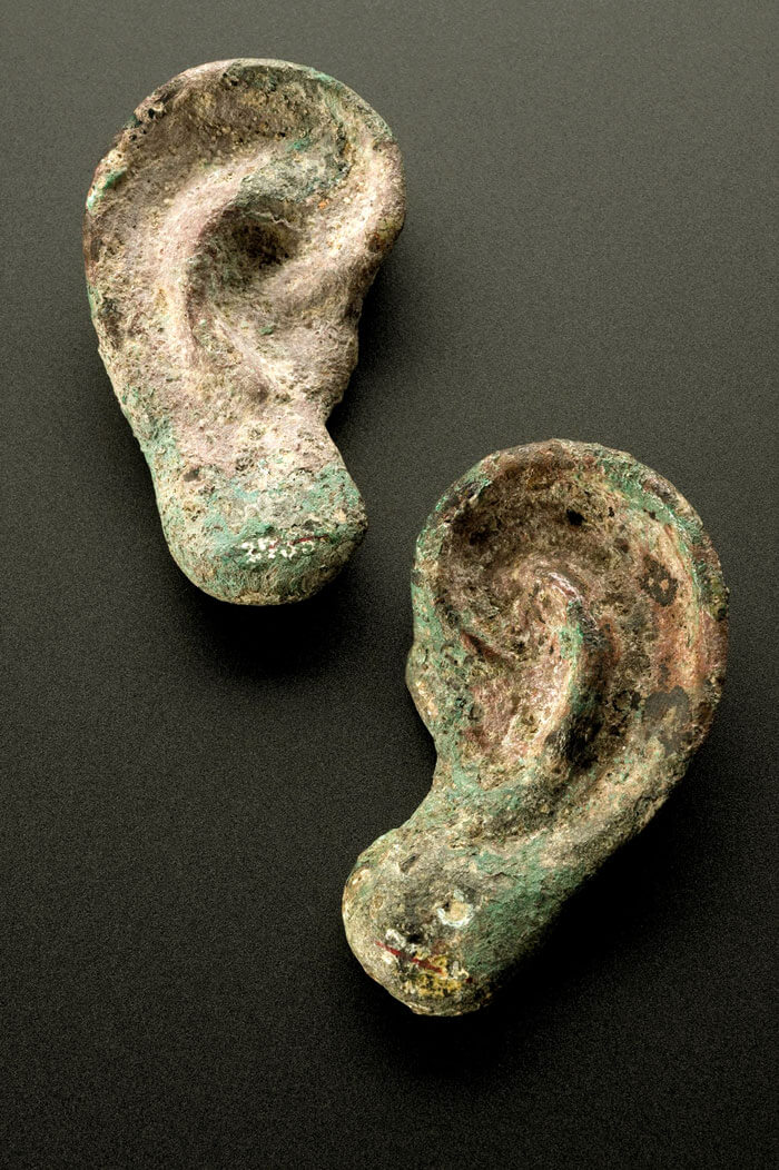 In ancient Egypt, three main ear functions are recognised and depicted: hearing, meditation while in prayer, and decoration as a support for earrings. Meditation while in prayer was very popular at that time, which explains the numerous stelae found in various museums (Figure 1). Votive ear, ear amulets and painted reliefs were also discovered, notably in funeral inscriptions. Votive ears became popular during the Greco-Roman period. They were presented to a god, either in the hope of a cure, in request of grace, or as thanks for a wish granted. They were made in the shape of the afflicted body part - in this case, a person’s ears. They may have been experiencing deafness or infection. Made from bronze, the ears are now coated with chemical compounds formed from corrosion (called bronze disease), which gives them their green appearance. The use of bronze may indicate a wealthy owner, as most votives were made from terracotta (Figure 2).