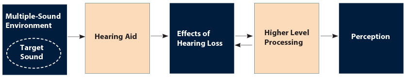 When perceiving sounds in real-world listening environments, older adults encounter several sources of degradation that can interfere with the perceptual process (Figure 1). Target signals (i.e. the sounds that a listener wants to focus on) have specific acoustic characteristics (e.g. spectral shape and changes in spectrum over time) that the auditory system must encode and resolve. These physical cues may be altered due to the presence of competing sounds or reverberation in the environment.