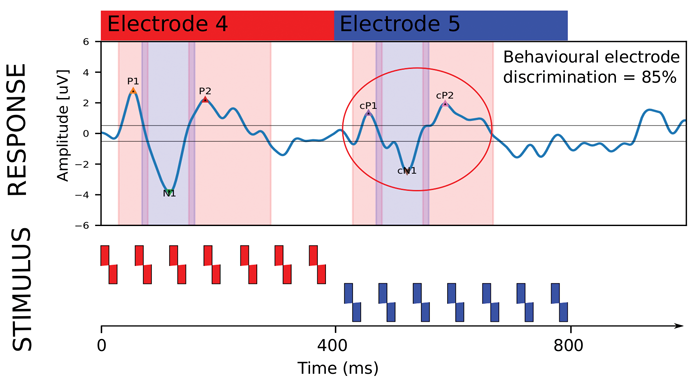 There are many cortical response measurement techniques and one that is currently of great interest is the electrically evoked auditory change complex (eACC). The eACC can be used for estimating discrimination abilities objectively and is a response to a change in an ongoing stimulus. One area of success has been in measuring electrode discrimination; see Figure 3 for a diagram showing the eACC response to a change in electrode stimulation. Pass/fail criteria for electrode discrimination based on eACC responses are highly correlated with behavioural responses and in turn speech perception abilities [8].