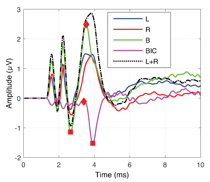 Figure 2. Shows the traces for determining the BIC. The blue trace is the eABR response for left (L) ear alone. The red trace is for the right (R) ear. The green is the response when both ears (B) are stimulated together. The black dashed line is the summed response for left and right ears. The pink trace shows the BIC (BIC=B-(L+R)).