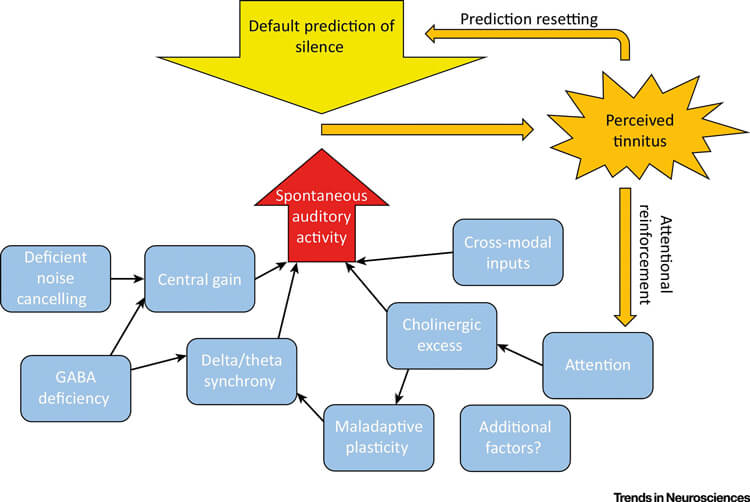 Figure 3. Emergence of tinnitus based on precision and prediction changes. The auditory pathway inherently has spontaneous activity (red arrow), which has low precision (arrow width) based on its random signal characteristics. In normal conditions this does little to overcome the default prediction of silence (yellow arrow). However, certain factors (blue boxes) increase its precision, leading to perception as a sound (orange). Once perceived, tinnitus is perpetuated by updating of default predictions and altered attention, which further increases precision. Image reproduced with permission from Sedley et al [5].