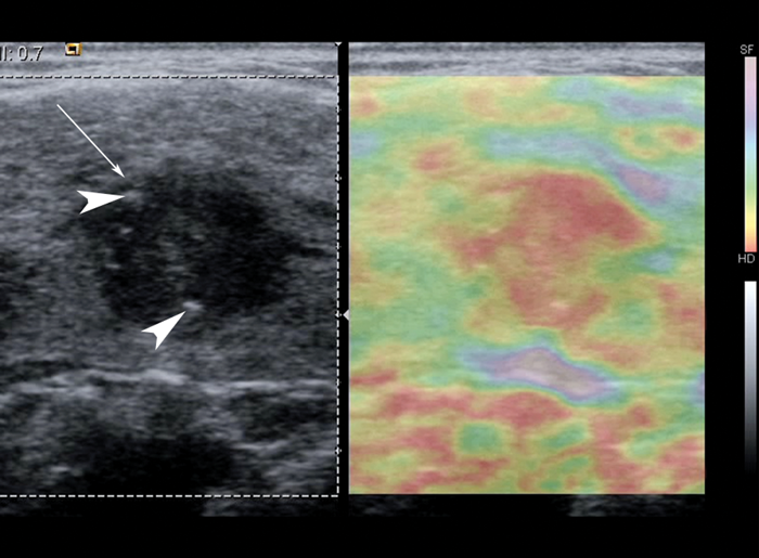 Figure 1: Grayscale US image with corresponding strain elastogram of a hypoechoic nodule (arrow) containing focal punctate calcifications (arrowheads), histologically confirmed as papillary thyroid carcinoma. The elastogram colour scale ranges from purple to red, indicating relatively soft to hard respectively. The nodule appears mostly red on USE, which suggests a relatively stiff nodule. Note that strain elastography displays relative strain, so this method requires the presence of normal tissue in the elastogram for reference.