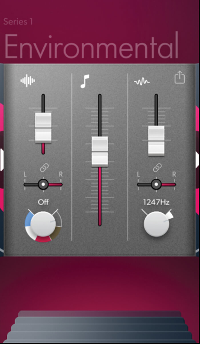 Sound therapy is a popular avenue for tinnitus-sufferers to explore: T-Minus (available for iOS) is a tinnitus wellness tool that is ideal for tinnitus sufferers who are looking for a large and highly customisable sound library. Through a detailed but well-thought-out interface, users can modify and blend a series of albums to create a personalised sound experience. The non-looped recordings are accompanied by sound controls to create further personalisation (i.e., pure tone generator, coloured noise playback and volume controls).