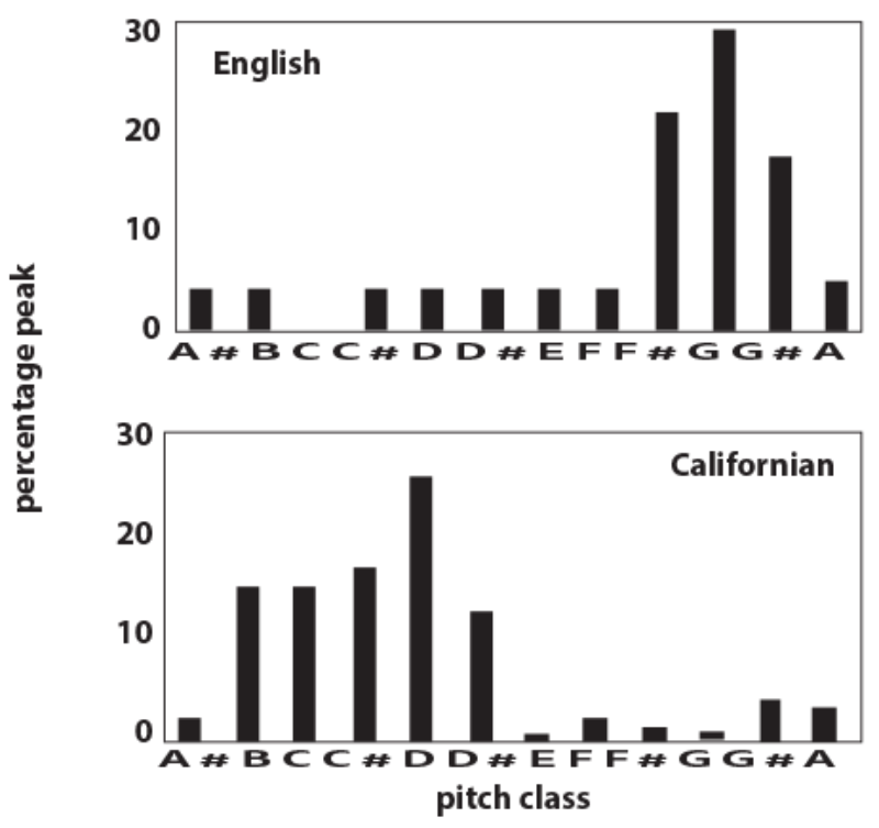 What we perceive appears to be related to our native language and dialect and there are considerable differences between different groups. Deutsch compared English speakers who had grown up in California with those who had grown up in the South of England. These two groups differed substantially in how they heard the Tritone Paradox: frequently when a Californian subject heard a pattern as ascending, a subject from the South of England heard the identical pattern as descending, and vice versa (Figure 2).