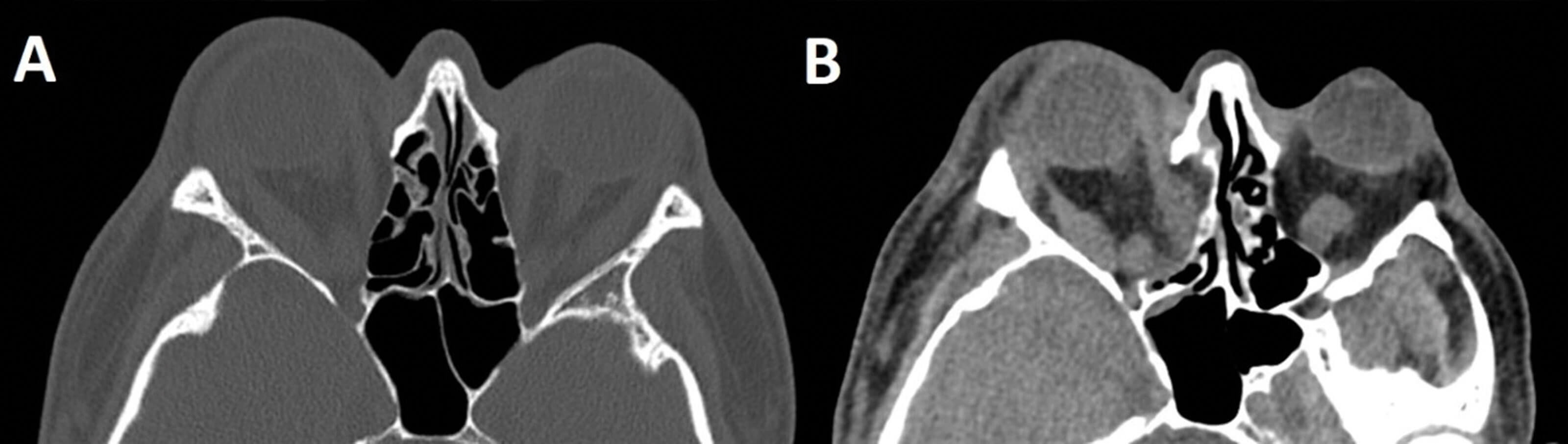 Figure 3. Pre and postop CT images of a patient with severe Grave’s ophthalmopathy. The postoperative CT neck performed prior to thyroidectomy demonstrates the right sided ‘two wall’ decompression and resulting prolapse of periorbital fat into the nasal cavity. A = preop axial slice showing severe exophthalmos with the entire globe anterior to the orbital rim. B = postop axial slice showing prolapse of orbital contents into nasal cavity and reduction in exophthalmos.