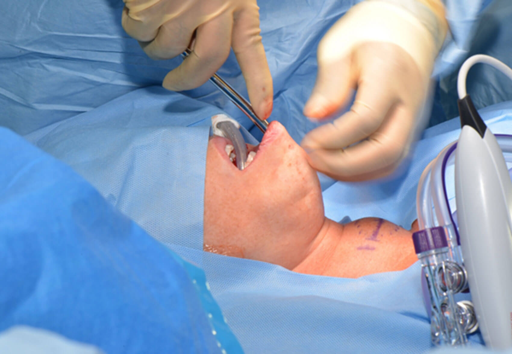 - Three oral incisions (one central and two lateral) marked, infiltration with local anaesthetic (bupivacaine 0.25% with adrenaline).