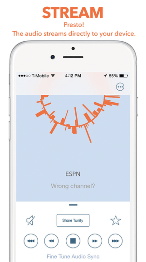 Tunity is an app that allows users to turn their smartphone into a mobile TV streamer that can be used with most TVs. To use it, the user simply takes a picture of the TV screen through the app (locating services must be turned on). The app then live streams the audio through their phone to headphones or Bluetooth-connected hearing aids. The app can be used virtually anywhere that has a TV; however, the range of channels currently available is limited and only includes American channels. One can only hope that Tunity (or other apps inspired by this technology) will soon deliver a wider range of channels, including ones from outside of the USA.