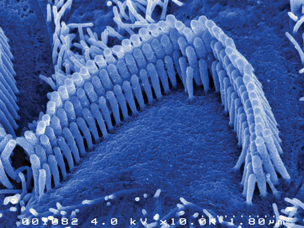 Another group has attempted to repair the hair cells in the deaf whirler mouse, which shows deafness and circling behaviour as a result of stereocilia defects [2]. Normal guinea pig stereocilia are shown in Figure 2. The Whirler mouse is a model of a human congenital deafness condition. The group, based at NIDCD in Bethesda, USA, has found that viral mediated gene transfection in the very young deaf whirler mice can restore the stereocilia to their normal shape and also decrease hair cell loss in these animals.