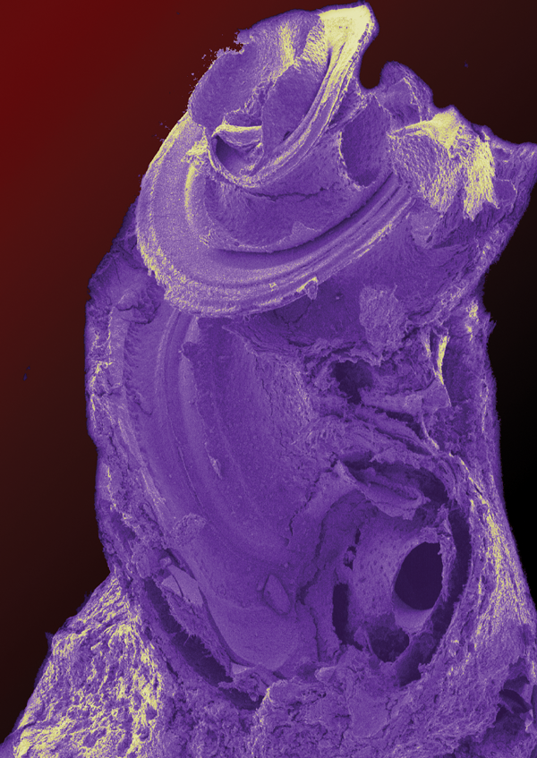 Figure 1. False coloured SEM of a mouse cochlea. The cochlea is about 2mm tall.