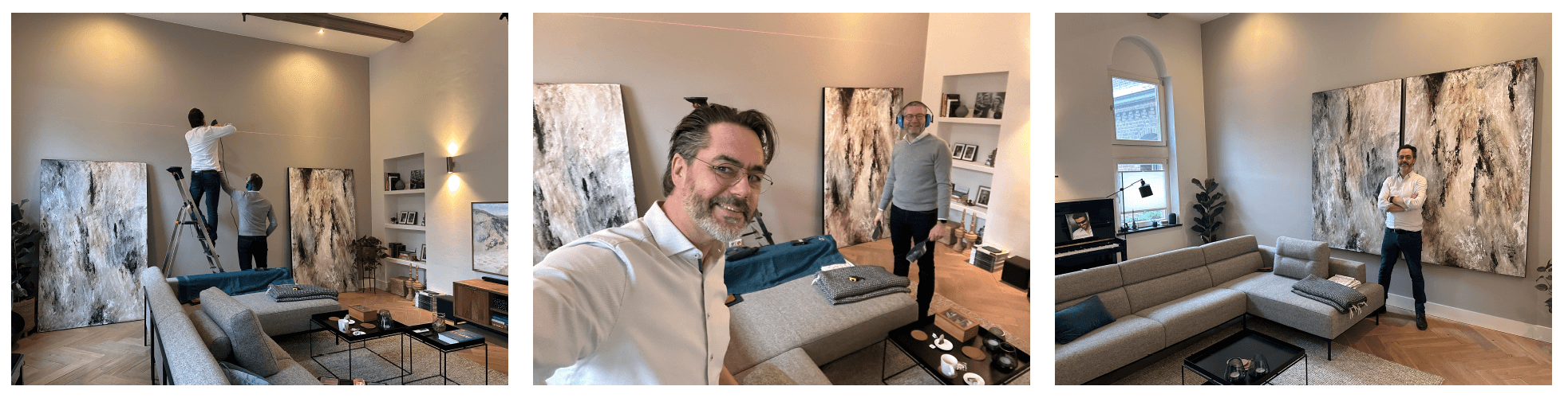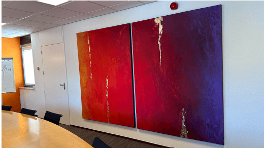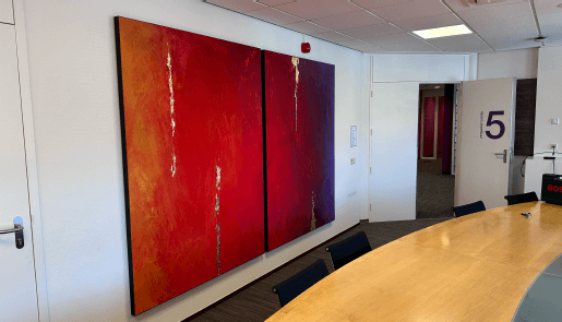 My colleague, Martin Stollman, a fellow clinical physicist audiologist, resides in a beautifully renovated former monastery. While the high walls and stunning architectural details of his home are captivating, the acoustics left much to be desired. Martin asked me to create a large diptych tailored to his home’s design. Together, we discussed form, colour, and texture, resulting in a piece that harmonises with his modern interior while adding warmth to the acoustic environment.