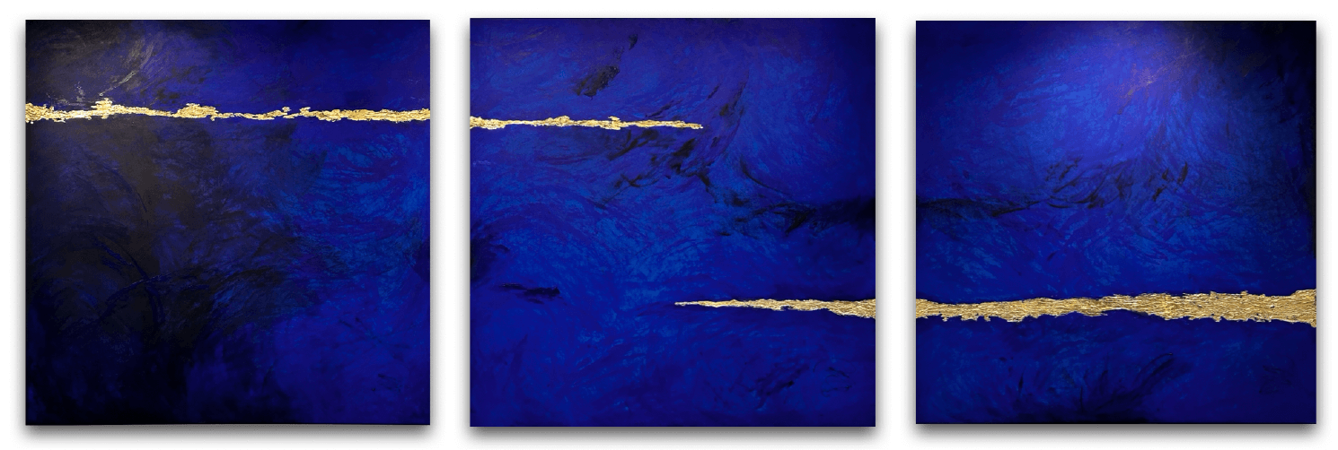 The triptych’s expansive scale allowed for a bold expression of themes central to both disciplines - connection, perception and transformation. The textures and golden lines, characteristic of my style, symbolise the scars and challenges we carry in life. These imperfections are not to be hidden but embraced as part of the whole, reflecting the resilience and growth that both art and audiology aim to inspire.