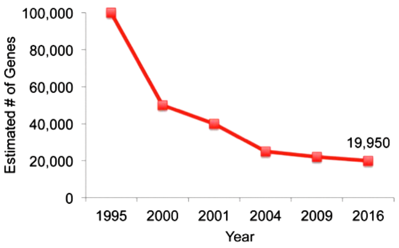 Figure 1. Number of predicted human protein-coding genes by year, 1995-2016. [3]