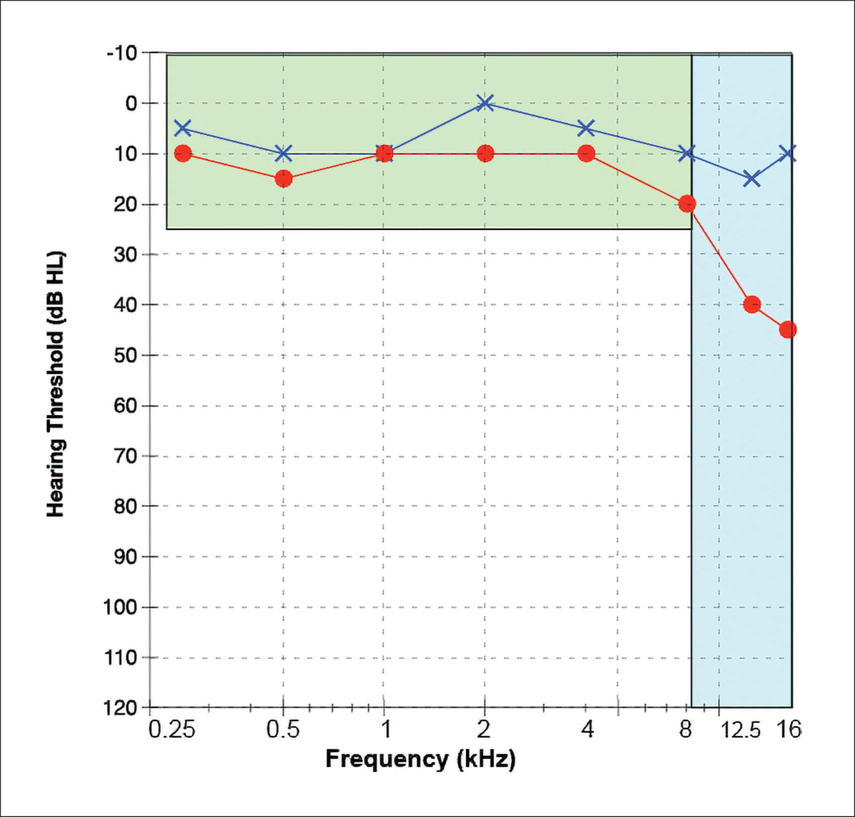 Figure 1: Audiogram with extended high frequencies (12.5 and 16 kHz).