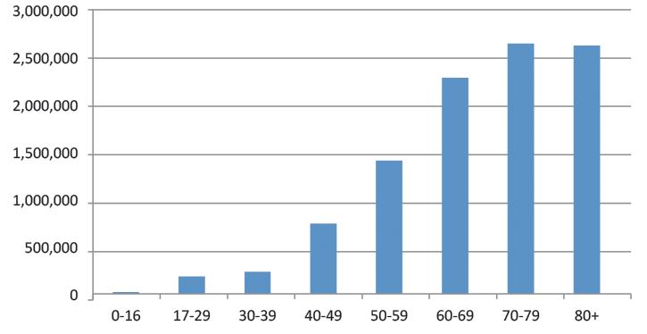 Hearing loss affects over 10 million people in the UK - one in six of the population. Of over 50-year-olds 41.7% are estimated to have some form of hearing loss. This rises to 71.1% of over 70-year-olds, over half of whom have moderate hearing loss and may benefit from hearing aids. Figure 1 shows the estimated numbers of people with hearing loss at different ages, with a big increase among people over 60. In fact, most people begin to lose their hearing as they get older and, with an ageing population, it is estimated that the number of people with hearing loss will exceed 14.5 million by 2031 [1].