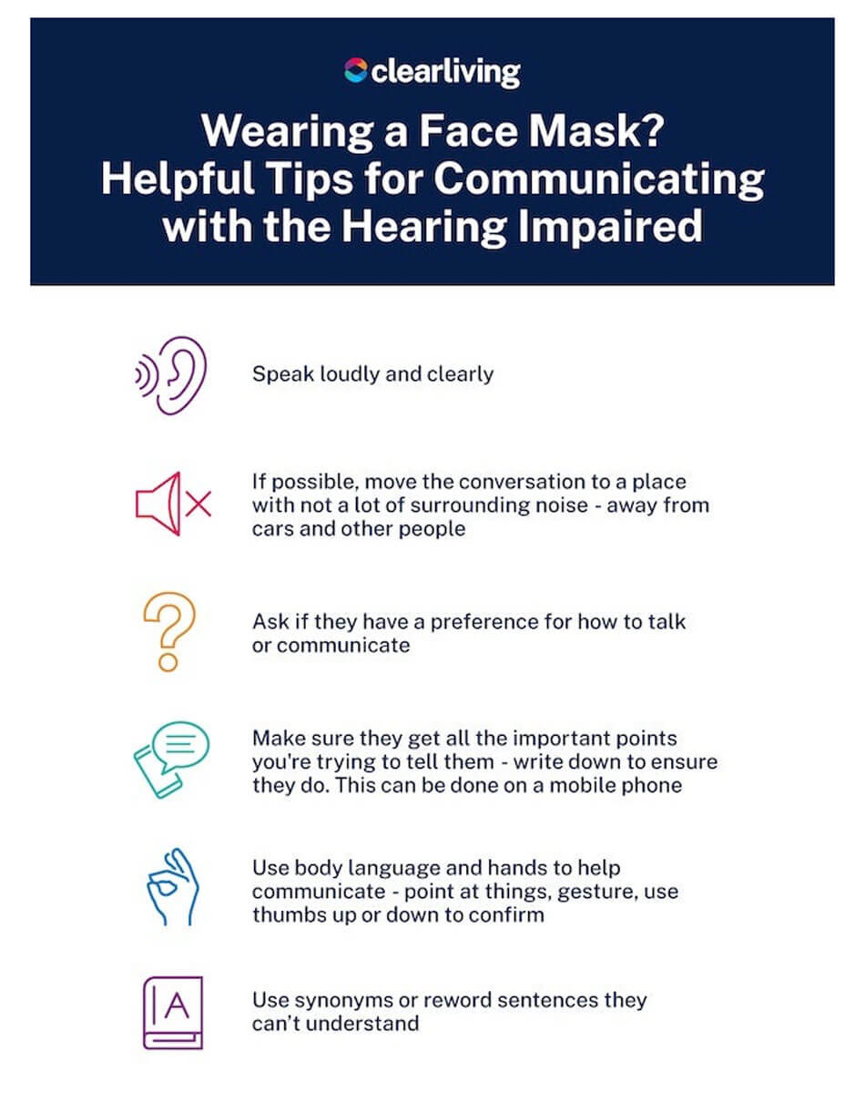 From preparing pre-written notes to ensuring a hearing aid isn't affected by a face mask, here’s the Clear Living visual graphic list of tips for those with hearing loss and if wearing a hearing aid: