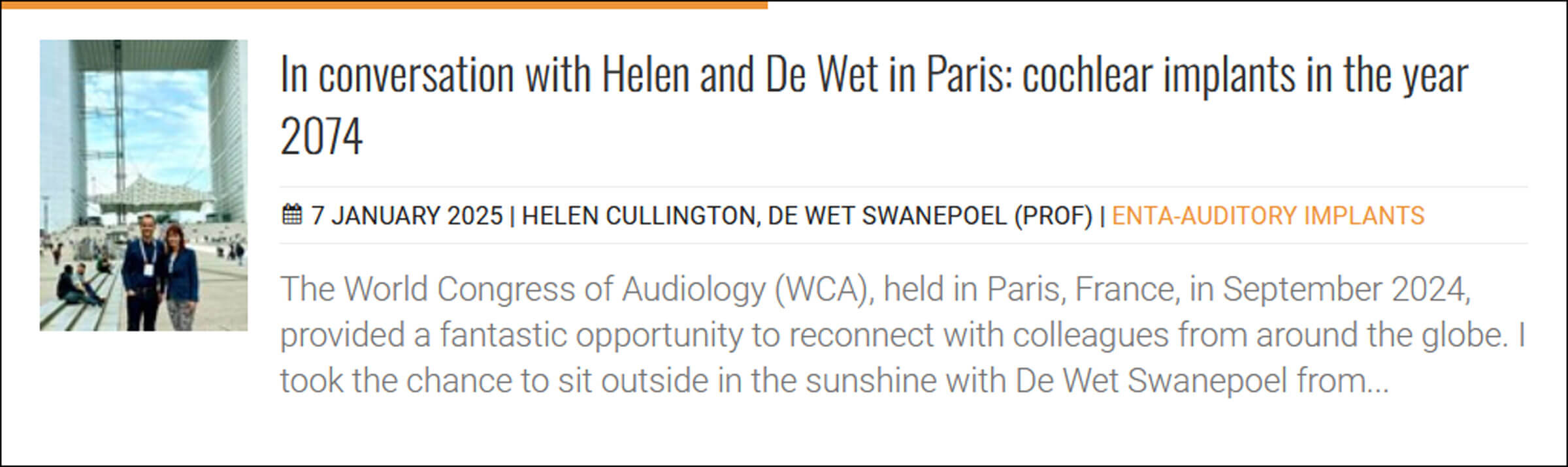 We like to look to the future, and when our Implantables Specialty Editor, Helen Cullington, and our Global Ambassador in South Africa, De Wet Swanepoel, met at the World Congress of Audiology in Paris in September, they projected their thoughts forward to imagine the field of cochlear implants in the year 2074.