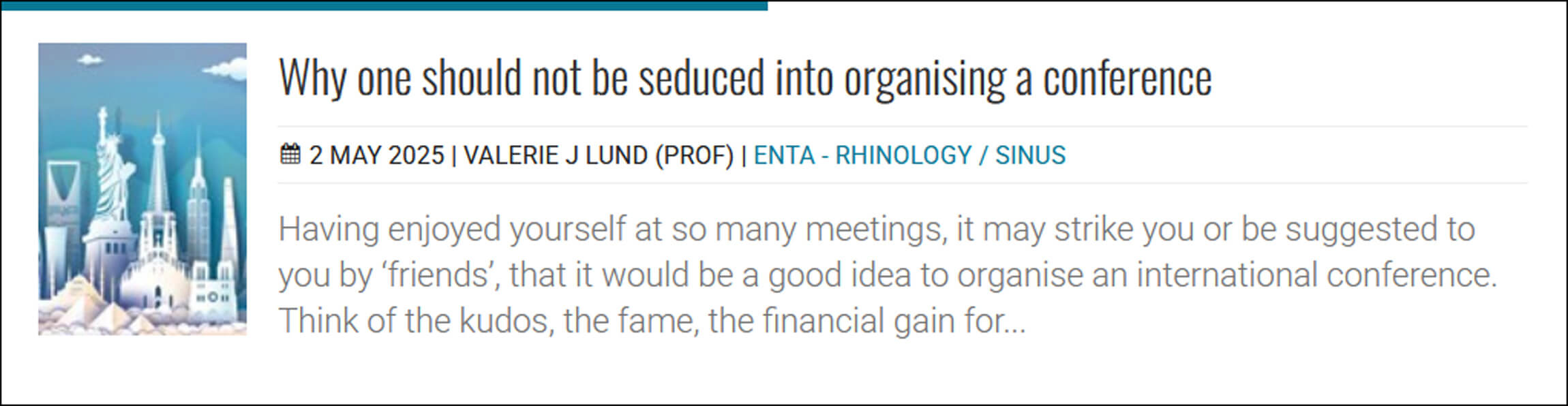 As ever, the ENT&A team are out and about at meetings and conferences: by the time you read this, I will have been at the ELS Congress in Warsaw, Rhian and Francesca will have been at ESPO in Stuttgart, and Rosaleen and Nova will be looking forward to attending the ERS meeting in Budapest in June. We have recently been at April’s AAA Conference in New Orleans.
