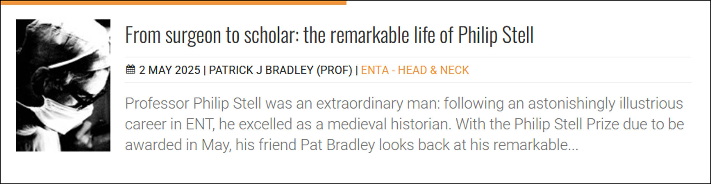 We also look back at the life of a remarkable ENT surgeon, who subsequently became a respected medieval historian - the life and times of Prof Philip Stell, as seen through the eyes of his friend and colleague Prof Pat Bradley.