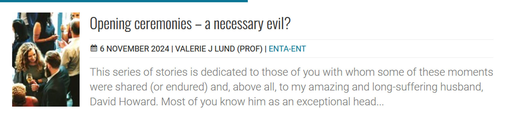 Speaking of meetings, for many years, the ENT community in the UK has gathered on the first Friday of each month for the regular meetings at the Royal Society of Medicine. Many congratulations to Patrick Axon and Michelle Wyatt, who are the new presidents of the sections of otology, and laryngology and rhinology respectively. I am delighted to be making my own debut as a speaker at the RSM on 7 February, when I will be talking about the management of acute vocal problems in singers.