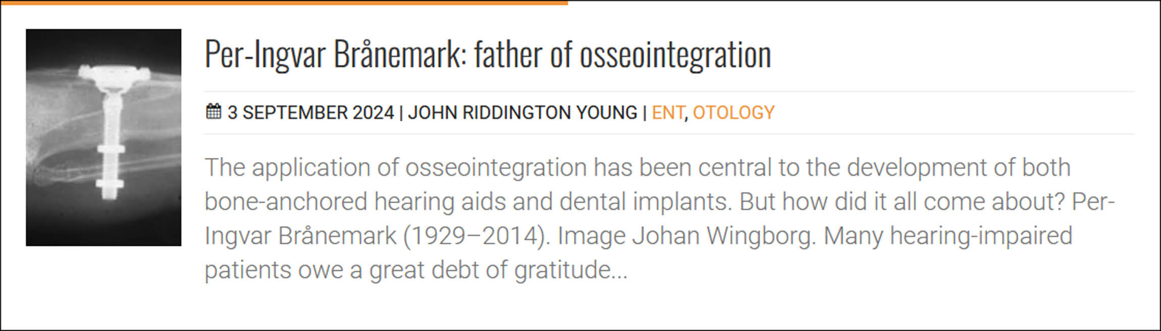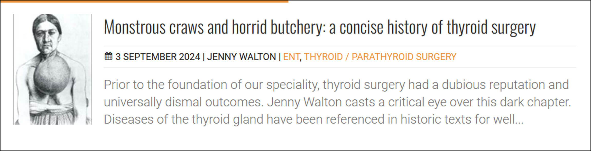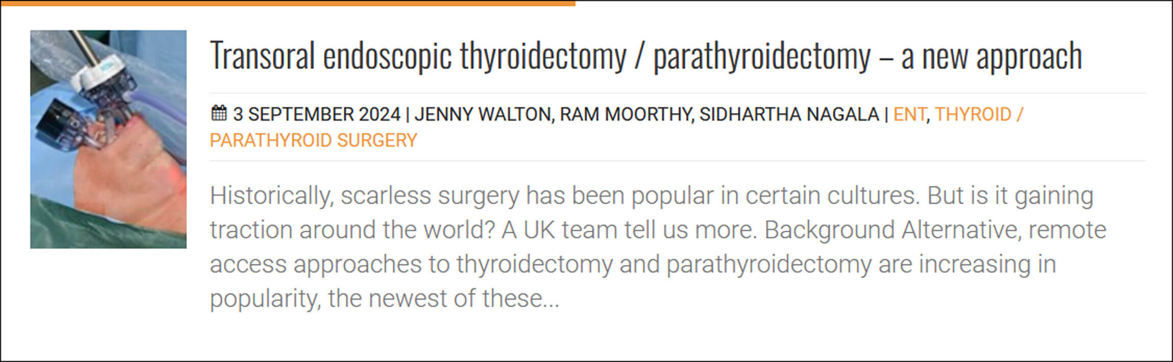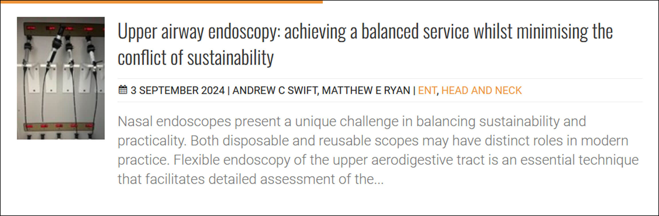 As always, the articles for September/October 2024 cover a very wide range of topics: two articles focus on thyroid surgery, one of which features a discussion of the (relatively new) ‘transoral’ approach for thyroidectomy. As loyal readers will know, the history of ENT is often covered by our roving historian, John Riddington Young, and this time he tells us about Per-Ingvar Brånemark, the ‘father of osseointegration’ - truly, many surgical developments have relied on his innovation. The topic of sustainability is never far from anyone’s minds these days; the healthcare sector is a large contributor to environmental degradation, and we are all mindful of the need to reduce waste. With this in mind, Andrew Swift (former President of ENT UK) discusses the balance between disposable and reusable endoscopes.