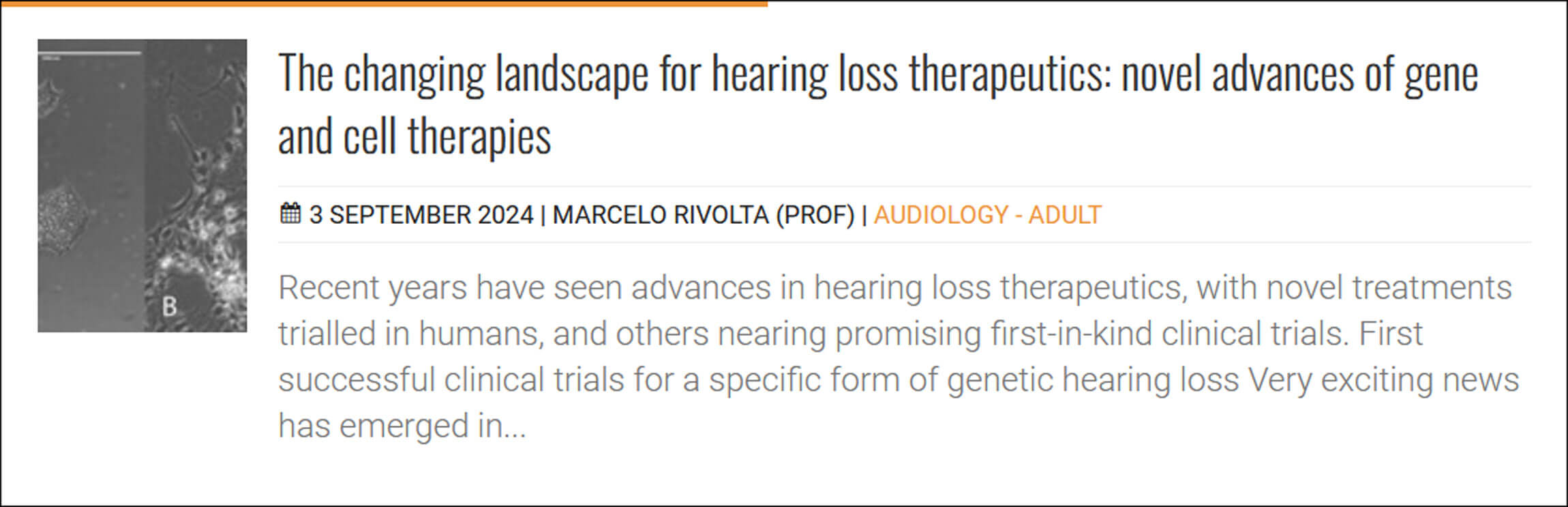 Taking a look at our audiology articles, we continue the theme of our previous supplement on inner ear therapeutics - Marcelo Rivolta develops this topic. Audiology colleagues will be interested to hear that a team of us will be at the World Congress of Audiology in Paris in September. We will be publishing eshots from the meeting to keep you abreast of hot topics, so if you are attending the meeting, click https://bit.ly/3YRdKCq to sign up for your daily digest.