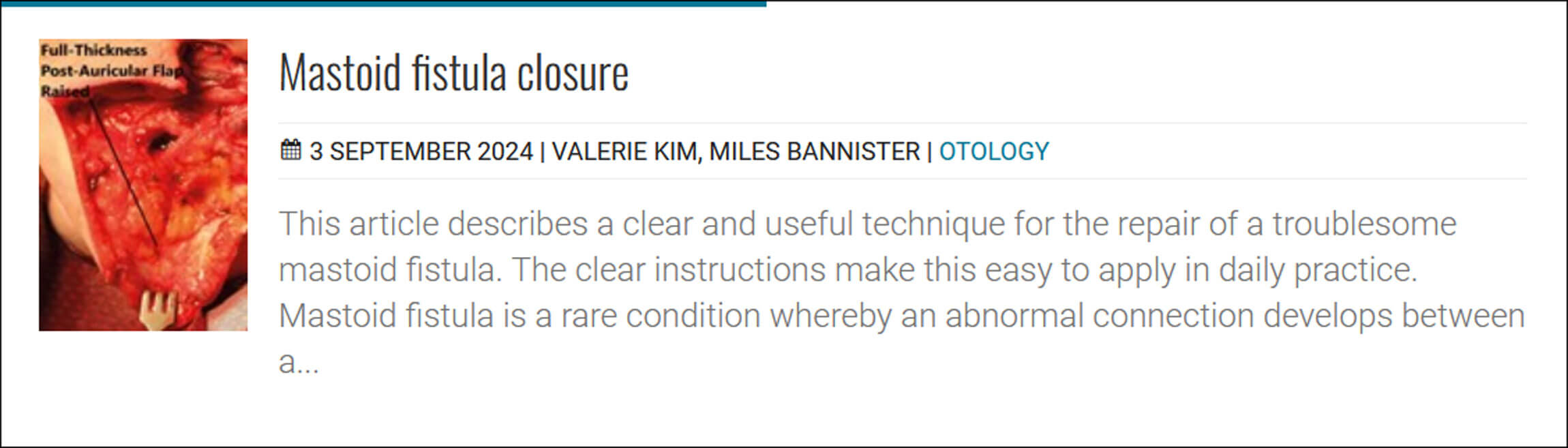 1. Jeannon JP. Robotic assisted orbital surgery (RAOS) - a novel approach to orbital malignancy surgery. ENT & Audiology News 2024;33(1):29-30.