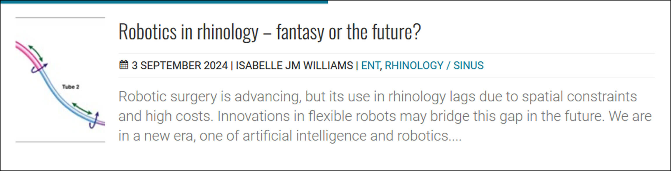 Robotics have found a place in ENT surgery, particularly in head and neck cancer surgery, and colleagues are looking for possible extended uses - we recently reported on the use of robotics in the treatment of orbital malignancy [1]. Isabelle Williams asks whether robotic surgery in rhinology is “fantasy or future”.