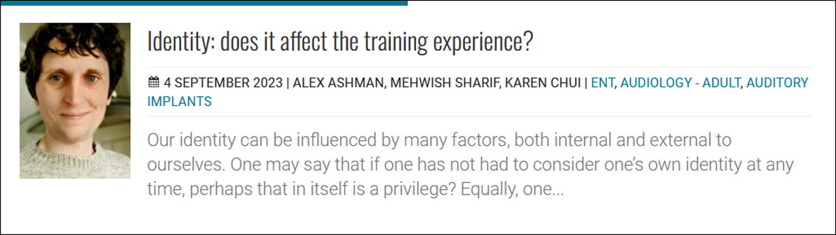 And - perhaps equally important - how do you come across to other people? For Sep/Oct 2023, we focus on the topic of ‘identity’. In the ENT articles, brought together by Katherine Conroy, we hear about topics as diverse as the after-effects of facial cancer, laryngeal gender surgery, racial prejudice against black surgeons, and surgeons’ own prejudices and how they can affect patient care. You can read Katherine’s introduction here. In our audiology articles, Crystal Rolfe and Teri Devine discuss ‘deaf identity’ and all its implications - click here to read more about the audiology features.