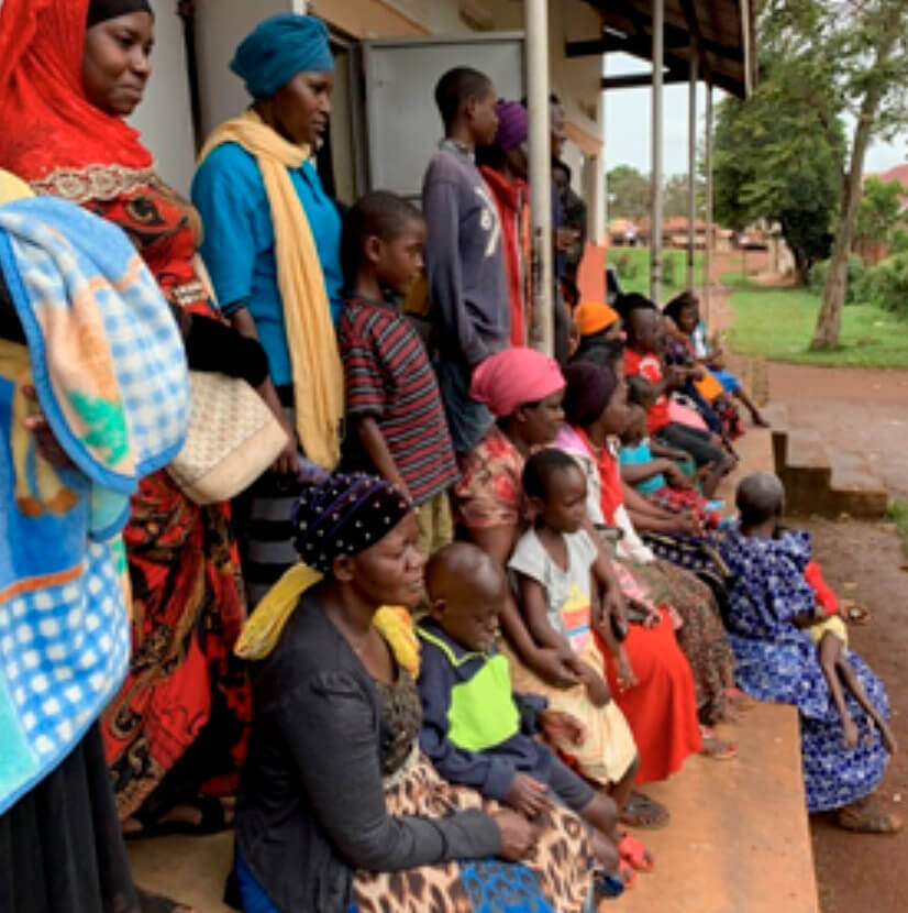 Families outside a school in Uganda.